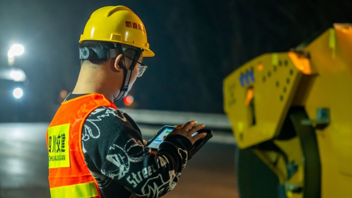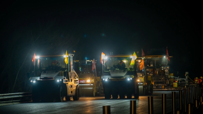 施工現(xiàn)場采用了智能攤鋪碾壓技術(shù),通過加裝在攤鋪機(jī)、壓路機(jī)上的北斗高精度定位系統(tǒng)、慣性導(dǎo)航系統(tǒng)和可視化等智能技術(shù),實現(xiàn)了24小時協(xié)同作業(yè),與傳統(tǒng)路面攤鋪相比,施工效率提高了33%。而且在智能化的加持下,更實現(xiàn)自動變道、自動避障,碾壓精度控制在0.5cm。