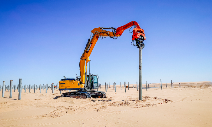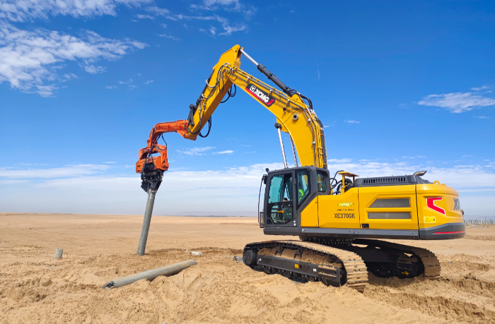 此次徐工挖掘機(jī)參建的巴彥淖爾100萬千瓦光儲+生態(tài)治理項(xiàng)目位于內(nèi)蒙古西部,是自治區(qū)年度重點(diǎn)工程,對當(dāng)?shù)刭Y源開發(fā)和綠色發(fā)展具有重要意義。 與以往常規(guī)項(xiàng)目不同,此次徐工挖掘機(jī)主要擔(dān)任光伏樁的鋪設(shè)工作,通過改裝振動錘和引孔機(jī)等多功能屬具,有效滿足現(xiàn)場多元化施工需求。