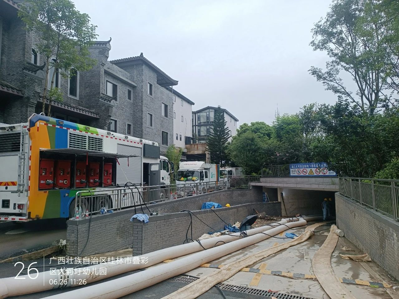 除桂林站地下停車(chē)場(chǎng)之外,徐工排澇產(chǎn)品還參與了桂林丹桂府小區(qū)以及大河圩旁的地下車(chē)庫(kù)內(nèi)澇救援任務(wù)。