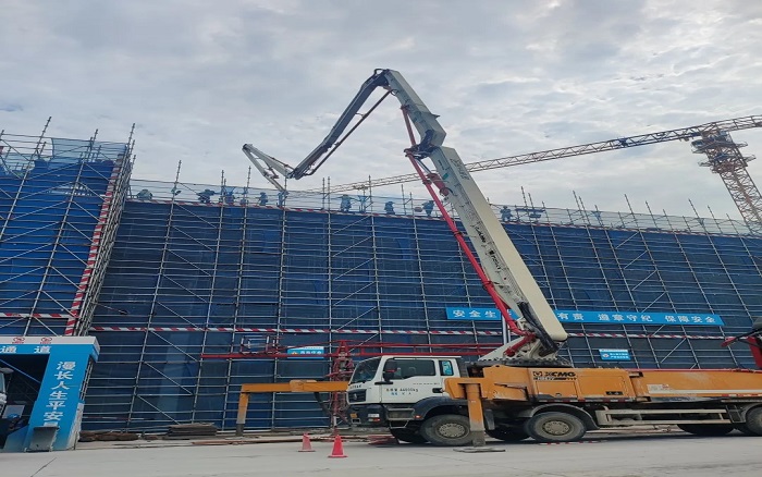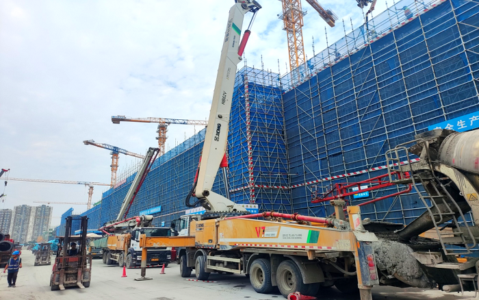 施工現場,臂架林立、機器運轉,徐工成套混凝土機械聯(lián)袂出擊,新能源攪拌車、車載泵、泵車齊上陣,從混凝土運輸、泵送施工、服務保障等方面守護項目順利進行。