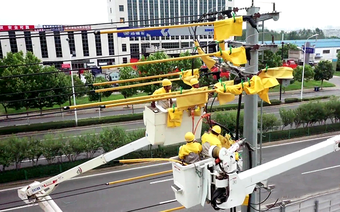 在電力桿線遷改施工現(xiàn)場,4名帶電作業(yè)人員嚴(yán)格做好安全措施后,穿上黃色的絕緣服,乘坐徐工GKJH21絕緣斗臂車升入高空,將跨滁河大橋上的原10千伏泗水04線上電纜與架空線連接引線斷開,為當(dāng)日連接新建線路做準(zhǔn)備。整個施工過程高效、安全、平穩(wěn),獲得現(xiàn)場施工負(fù)責(zé)人的認(rèn)可。
