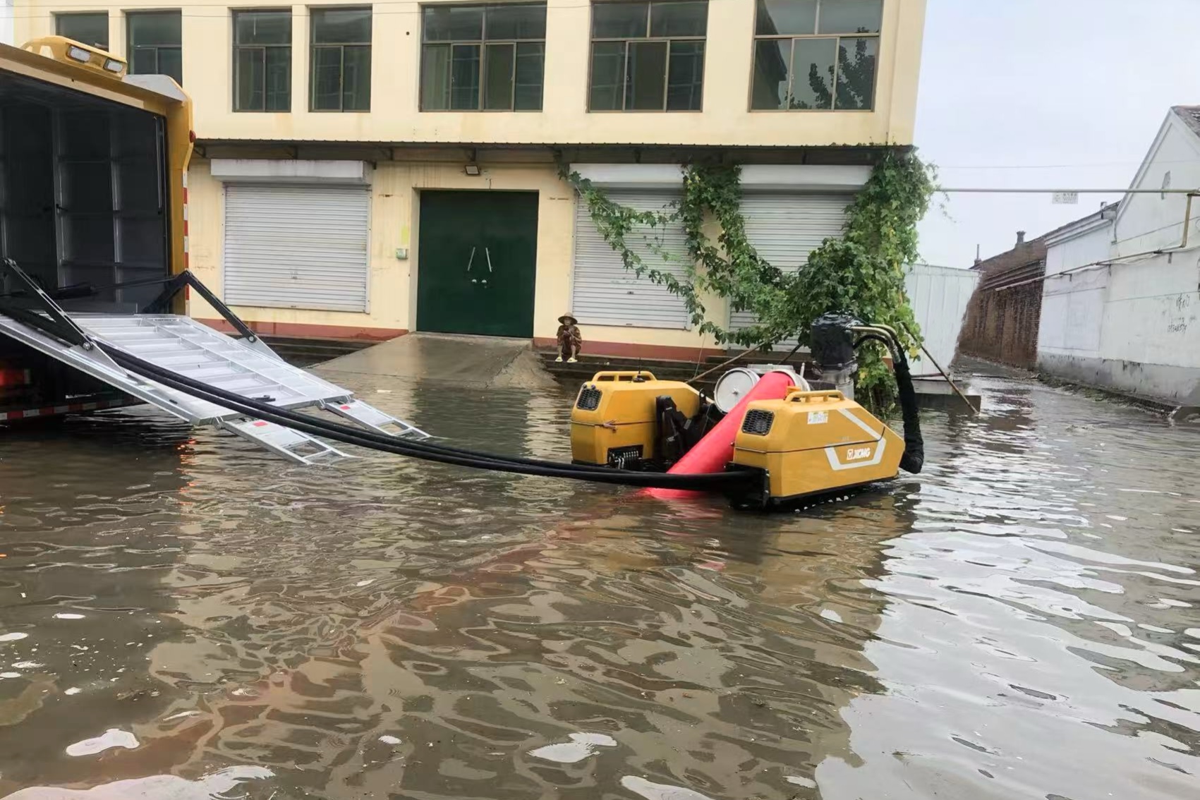 首日,車輛到達(dá)現(xiàn)場(chǎng)后,徐工救援人員立即針對(duì)現(xiàn)場(chǎng)環(huán)境制定排水方案。由于場(chǎng)地狹窄,大型救援車輛轉(zhuǎn)彎調(diào)頭不便,最終救援人員決定充分發(fā)揮“子母式排澇車”子車探入作業(yè)與履帶底盤(pán)小半徑轉(zhuǎn)彎優(yōu)勢(shì),將母車停至路口,遙控子車帶著120米水帶“穿街走巷 靈活走位”,將積水源源不斷排入下水道。連續(xù)作業(yè)6小時(shí)后,PS30F4累計(jì)排水超14000立方,因雨勢(shì)逐漸增大,第一天救援被迫中止。