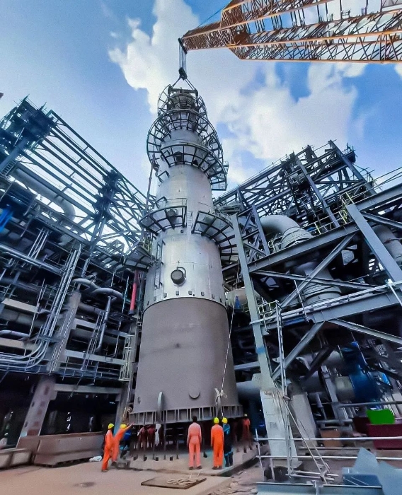 吊裝過程中,徐工XLC30000履帶起重機采用108m超起主臂單雙臂增強工況,將重達650t的項目首臺氫化反應(yīng)器緩緩起吊豎立,并提升至40m高處,隨后完成吊載回轉(zhuǎn),精準(zhǔn)落置在指定安裝位置。