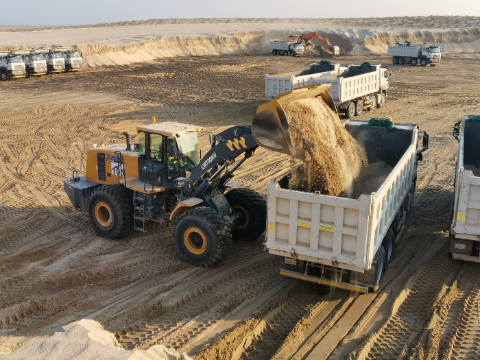 亞洲某國,新建大型公園建設(shè)現(xiàn)場,徐工LW700HV與ZL50GN相互配合高效進行著土方作業(yè)。2020年,客戶開始采購徐工設(shè)備,對ZL50的作業(yè)性能與可靠性非常滿意,隨著業(yè)務(wù)量的不斷增加,客戶開始考慮大噸位產(chǎn)品。經(jīng)過當?shù)匦旃やN售的全力推薦,客戶加購了徐工LW700HV裝載機,該產(chǎn)品也已優(yōu)異表現(xiàn)贏得客戶的贊賞。配合自卸車,對密度約1.8t/m3的沙土進行轉(zhuǎn)運作業(yè),徐工LW700HV搭配4.5m3鏟斗作業(yè)起來效率驚人。