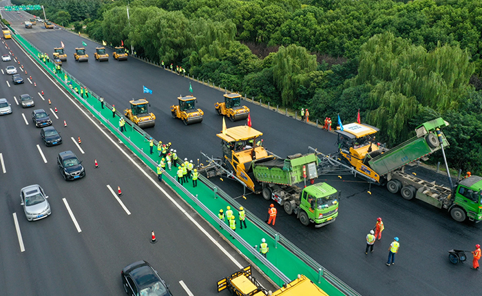 常泰長(zhǎng)江大橋大寬度整幅面層的“一鍵鋪平”,也備受矚目。進(jìn)行此次攤鋪工作的是徐工自主研發(fā)的大米數(shù)攤鋪機(jī)和13噸雙鋼輪壓路機(jī),攤鋪寬度15m,厚度4cm,屬于大寬度的整幅面層攤鋪,實(shí)現(xiàn)施工效率、橋面平整度雙提升。鋪裝工程涵蓋了橋面、主路、匝道等多個(gè)施工場(chǎng)景,充分體現(xiàn)出徐工設(shè)備的廣泛適用性和靈活性。無論是寬闊的主橋面,還是復(fù)雜的匝道區(qū)域,都能實(shí)現(xiàn)高質(zhì)量的整幅面層攤鋪。