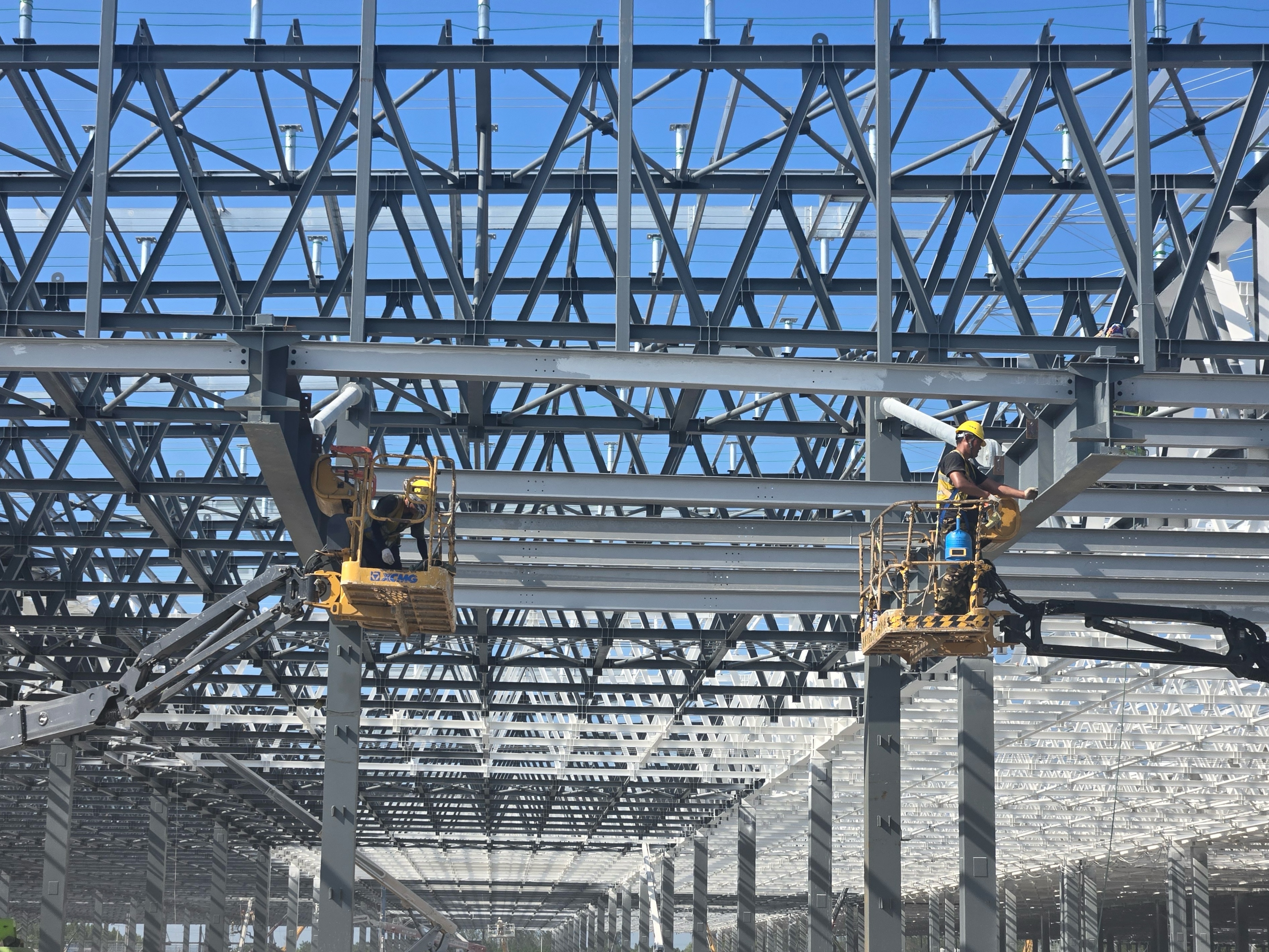 在施工現(xiàn)場(chǎng),多臺(tái)徐工高空作業(yè)平臺(tái)同時(shí)作業(yè)。XGS28K 伸展長(zhǎng)臂,將施工人員和工具平穩(wěn)送至指定高度,其快速的升降和回轉(zhuǎn)動(dòng)作大大縮短了單個(gè)作業(yè)點(diǎn)位的施工時(shí)間。XGS34K 則在大面積高空作業(yè)區(qū)域展現(xiàn)出高效率,大范圍的作業(yè)覆蓋能力減少了設(shè)備頻繁移位的時(shí)間損耗。XGS22K 于狹窄區(qū)域靈活補(bǔ)位,確保施工進(jìn)程無(wú)死角推進(jìn)。它們相互配合,使蔚來(lái)汽車三期項(xiàng)目的高空施工環(huán)節(jié)如行云流水般順暢,有效提升了整體施工效率,大幅縮短了項(xiàng)目工期。