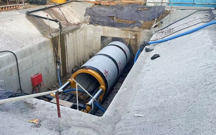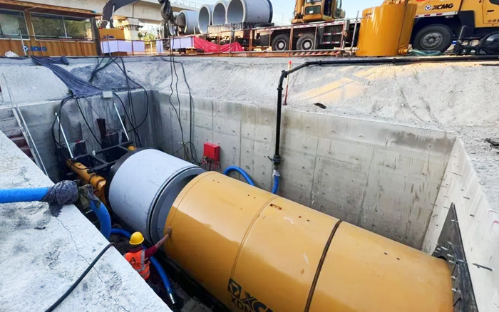 本次頂管穿越巖層為強(qiáng)風(fēng)化片麻巖層,與上覆砂層最小厚度僅為1m,頂進(jìn)時(shí)有較大塌方風(fēng)險(xiǎn)。為了確保頂管施工安全,客戶自行采購(gòu)了國(guó)內(nèi)先進(jìn)的徐工XDN1800-R“泥水平衡”巖石頂管設(shè)備。