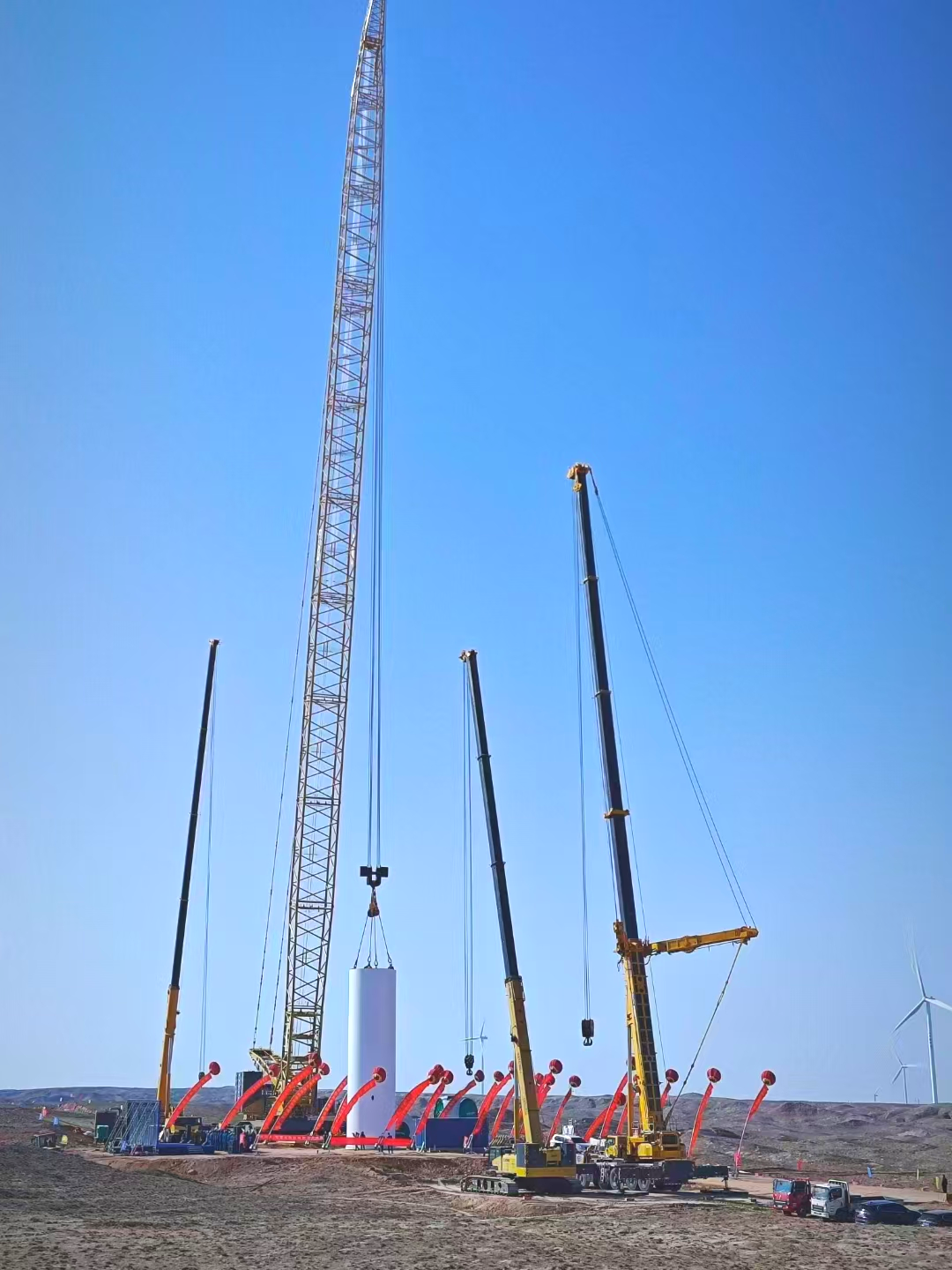 隨著施工號角吹響,各臺起重機(jī)緊密配合,XLC18000M采用138+8m的標(biāo)準(zhǔn)風(fēng)電工況,穩(wěn)穩(wěn)將98m長的葉片與112t重的輪轂、葉片在百米高空精確連接到機(jī)艙,XGTC160-I、XCA600L8 和 XCA200L8_2則靈活調(diào)整位置,輔助完成關(guān)鍵部件的吊裝,整個吊裝過程精確無誤。