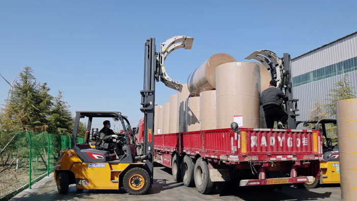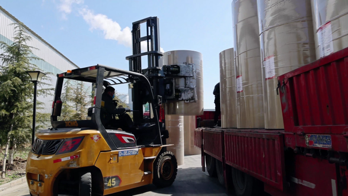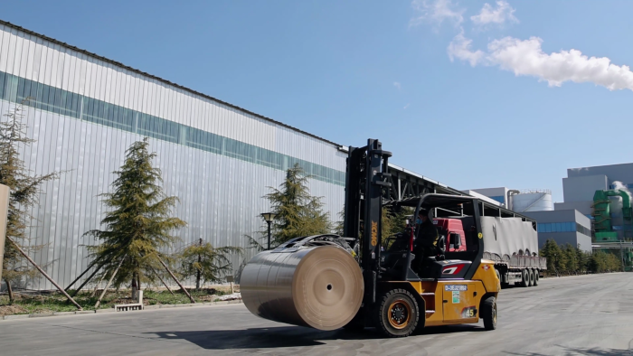 十幾臺徐工孔雀系列電動平衡重叉車搭配紙卷夾屬具穿梭忙碌