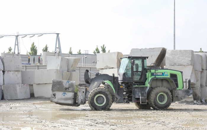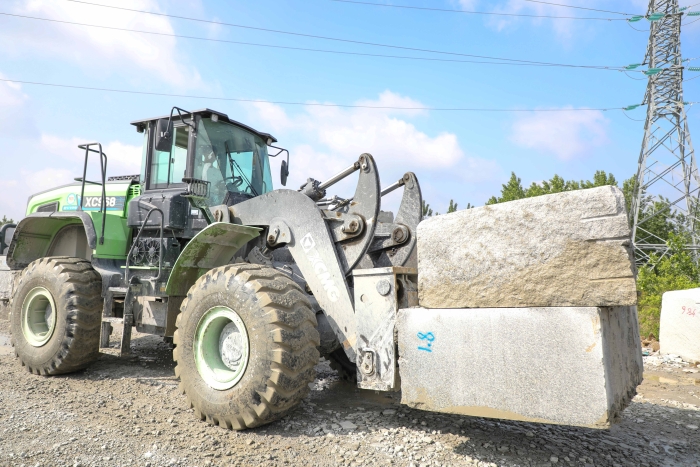 華中腹地,某大型石材加工內(nèi),全球首臺徐工XC968EV-T20純電動石材叉裝機在原石堆放區(qū)輾轉(zhuǎn)騰挪,高效完成著原石卸貨,整理碼放及轉(zhuǎn)運上料等工序。連續(xù)不斷的電機蜂鳴聲,演奏著建設(shè)綠色未來的樂章。