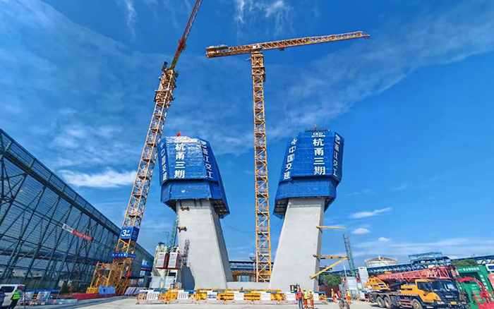 在杭甬復(fù)線寧波三期甬江特大橋施工現(xiàn)場,1臺(tái)徐工XGT3000-120S、2臺(tái)XGT3000-100S如鋼鐵巨人伸展手臂,正加緊進(jìn)行著鋼筋部品的吊裝,助力3座大橋主塔以平均每天1米的速度向云端挺進(jìn),贏得施工方“技術(shù)先進(jìn)、安全可靠、吊裝能力強(qiáng)、操作平穩(wěn)、智能化水平高、施工效益顯著”的高度肯定。