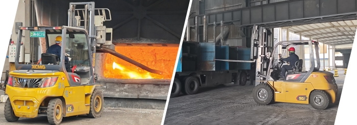 不止新疆,在華東某大型冶金廠,孔雀4.5噸叉車正在進(jìn)行爐前作業(yè);在華南電解鋁行業(yè)的強(qiáng)磁車間內(nèi),5噸孔雀叉車在進(jìn)行原材料搬運工作。