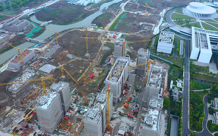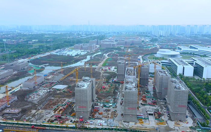 西湖大學(xué)云谷校區(qū)正一片火熱,高聳的徐工群塔正揮舞長臂、緊張施工,與遠(yuǎn)處的青山綠水交相輝映,盡情展現(xiàn)力與美的結(jié)合。