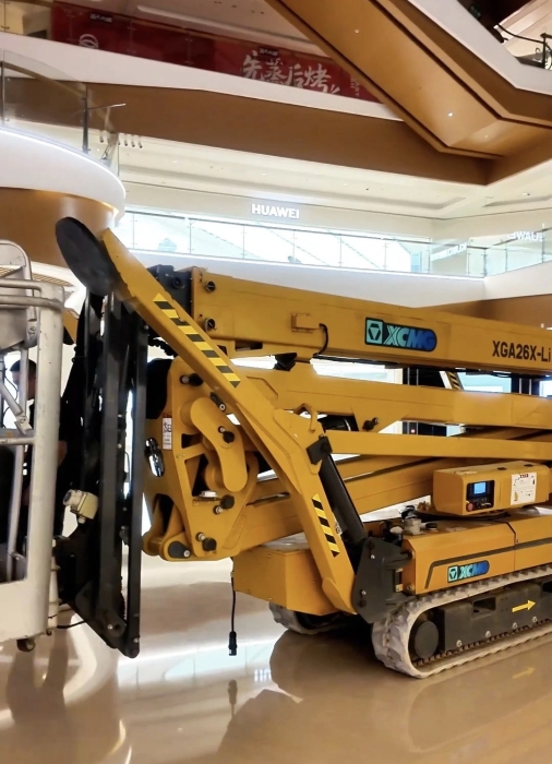 在杭州某大型商場,徐工XGS26X-Li將四只“蜘蛛腿”穩(wěn)穩(wěn)“扎根”在商場中庭,正在向玻璃圍欄下方的墻壁伸展臂架。超窄車身“溜”進商場、伸縮臂架“瞄”準(zhǔn)墻面,這是徐工蜘蛛車在商場進行維修保養(yǎng)的日常。而看似日常的施工,需要面對三關(guān)“難題”。