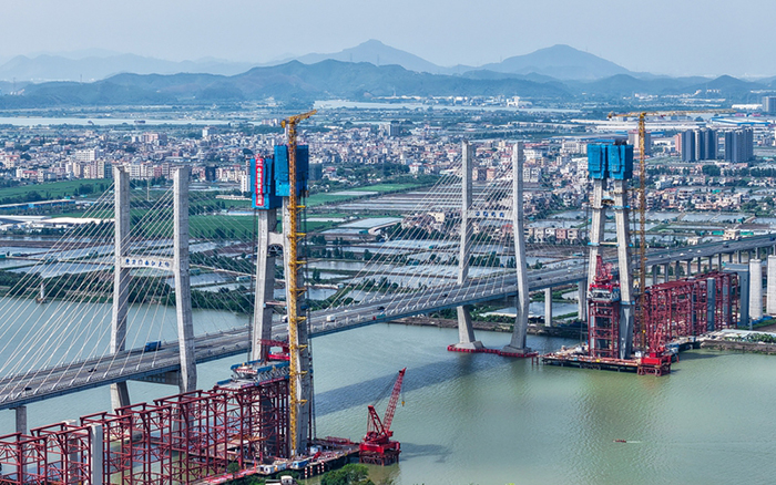 目前,深江鐵路跨磨刀門水道主橋東主塔已封頂。