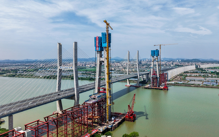 在深江鐵路重難點(diǎn)工程——跨磨刀門水道主橋施工現(xiàn)場,兩臺徐工XGT7527A-18S正穩(wěn)定吊裝,橫梁與對應(yīng)部位的塔柱同步施工,后續(xù)4臺施工升降機(jī)也將陸續(xù)入駐項(xiàng)目,共同助力主橋中、上塔柱爬升施工。