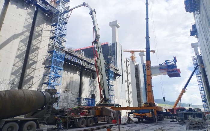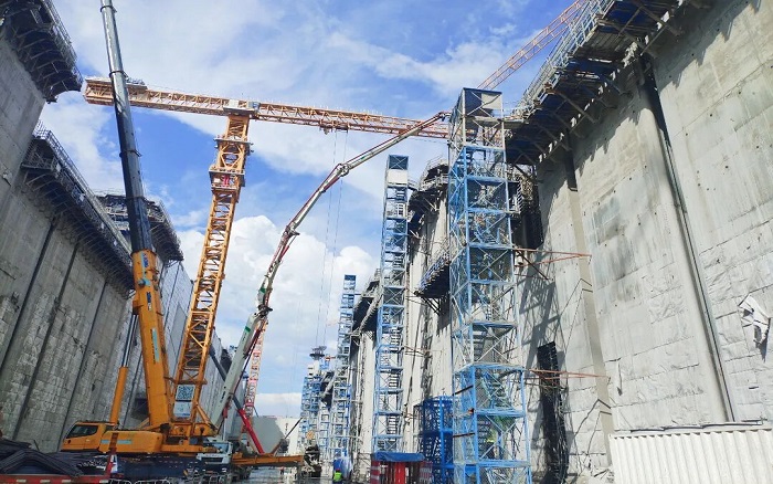 閘門立柱高聳入云,澆筑精度要求堪比“云端繡花”。徐工泵車、起重、塔機成套化裝備舉重若輕,天塹之間“穿針引線”!