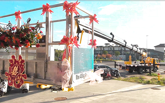 這輛 GKS45A 高空作業(yè)車剛完成交付,客戶便別出心裁地將其打造成婚車。車頭的 “囍” 字鮮艷奪目,車身纏繞的紅綢與花束將機(jī)械的硬朗感與婚禮的浪漫感巧妙融合。在喜慶的音樂與路人的祝福中,它行駛在婚車隊(duì)列之首,成為新人幸福旅程的 “硬核” 見證者。