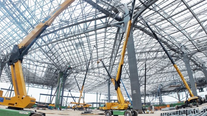西安東站建設(shè)工地上,徐工高空作業(yè)平臺(tái)組成“鋼鐵軍團(tuán)”正全速推進(jìn)施工。10余臺(tái)30-40米直臂車伸展巨臂,精準(zhǔn)對(duì)接站房屋頂鋼結(jié)構(gòu)焊接;12米剪叉車靈活穿梭,高效配合內(nèi)部砌墻作業(yè)。