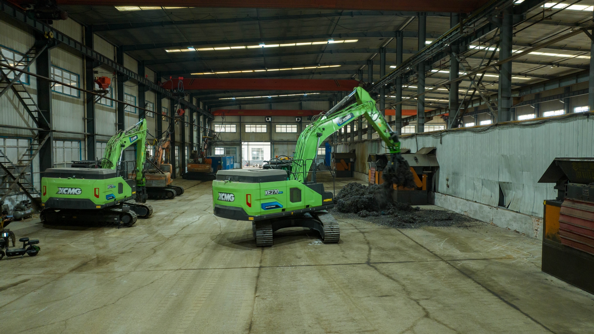 在河北唐山某鋼廠內(nèi),兩臺(tái)徐工XE270EV純電動(dòng)挖掘機(jī)正靈活地進(jìn)行鐵屑裝車作業(yè),與傳統(tǒng)燃油設(shè)備轟鳴、濃煙滾滾的場(chǎng)景不同,這里只有電機(jī)運(yùn)轉(zhuǎn)的低鳴和高效作業(yè)的節(jié)奏聲。