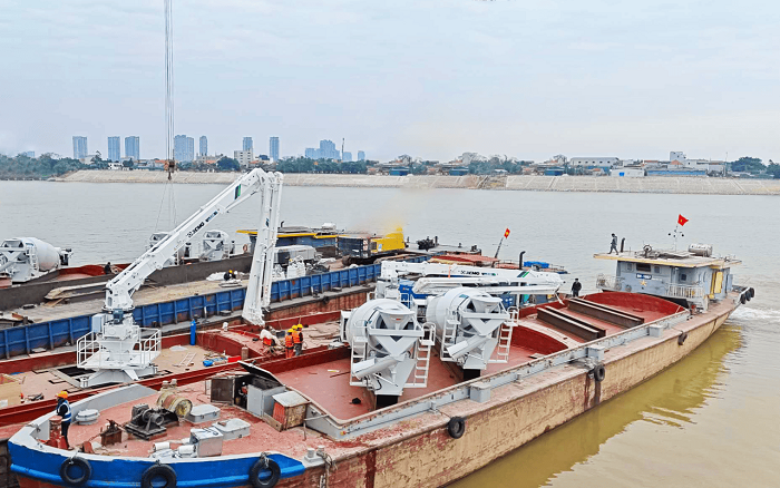 近日,專為水上施工定制的兩臺徐工船載式布料機(jī)與八臺船載式攪拌罐裝車順利集結(jié),正式發(fā)往越南,將投入到當(dāng)?shù)刂攸c跨河大橋項目建設(shè)中。