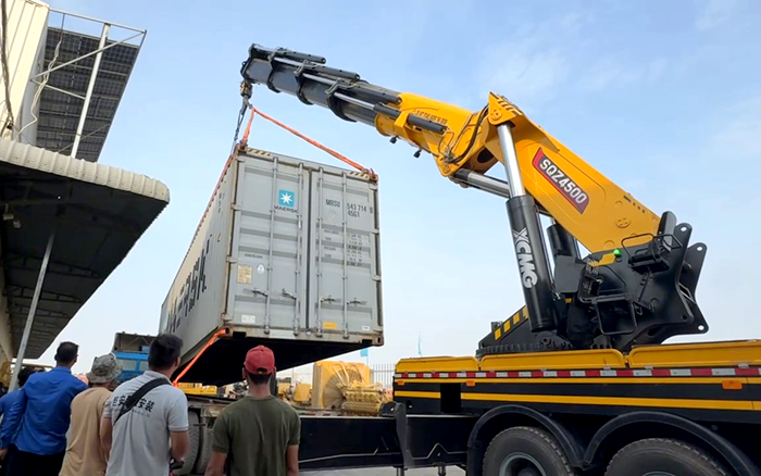 涼季東南亞,某碼頭貨箱錯(cuò)落排布。徐工 SQZ4500C 折疊臂起重機(jī)靜靜佇立,伸展臂架,開(kāi)啟一天的集裝箱轉(zhuǎn)運(yùn)作業(yè)。