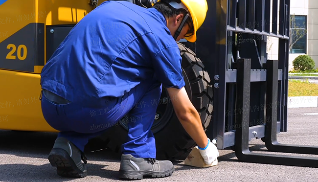 2.擋位操縱手柄置于空擋,拉起駐車制動,用楔木墊好前后輪胎,雙重固定。