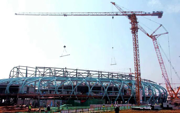滁州奧體中心項目位于明湖景觀區(qū)域,規(guī)劃占地約1100畝,總建筑面積約13.4萬平方米,主要建設(shè)項目為一場兩館、含全民健身中心和大型體育生態(tài)公園。徐工塔機多臺XGT7022-12S產(chǎn)品參與滁州奧體中心項目建設(shè),經(jīng)過近一年的緊張施工,項目主體混凝土施工已基本完成,進入鋼構(gòu)吊裝建設(shè)。