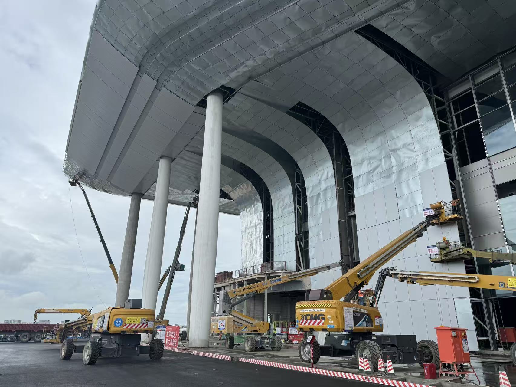 而在站房外圍,立面幕墻施工正面臨另一重考驗(yàn)。異形鋁板的高精度安裝,要求設(shè)備必須具備大范圍覆蓋與穩(wěn)定的高空輸送能力。徐工大米級直臂車以超強(qiáng)的舉升能力和長臂架延展性,成為幕墻安裝的“主力軍”。即使在高空強(qiáng)風(fēng)環(huán)境下,智能臂架控制系統(tǒng)依然能保證作業(yè)平臺穩(wěn)固,讓工人能從容完成定位、校準(zhǔn)與固定。其高效的轉(zhuǎn)場能力,更使得設(shè)備在長達(dá)數(shù)百米的作業(yè)面上快速調(diào)配,大幅縮短了工期。
