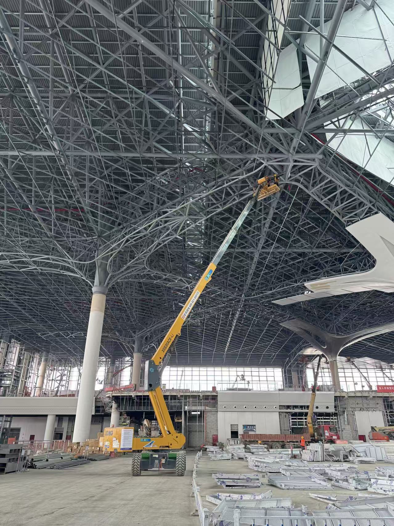 步入站房內(nèi)部,抬頭仰望,巨大的穹頂鋼結(jié)構(gòu)如編織的“榕樹”根系交錯延伸,施工難度極高。面對最高處近30米的作業(yè)高度,徐工30米級電動直臂車展現(xiàn)了其“進(jìn)得去、站得穩(wěn)、伸得準(zhǔn)”的硬核實(shí)力。設(shè)備采用緊湊設(shè)計與精準(zhǔn)操控系統(tǒng),在站內(nèi)狹長的通道和密集的臨時支撐架間靈活穿行,憑借平穩(wěn)的臂架伸縮與微動性能,施工人員得以在籃筐內(nèi)如履平地,精準(zhǔn)完成高空焊接、螺栓緊固及防火涂料噴涂。
