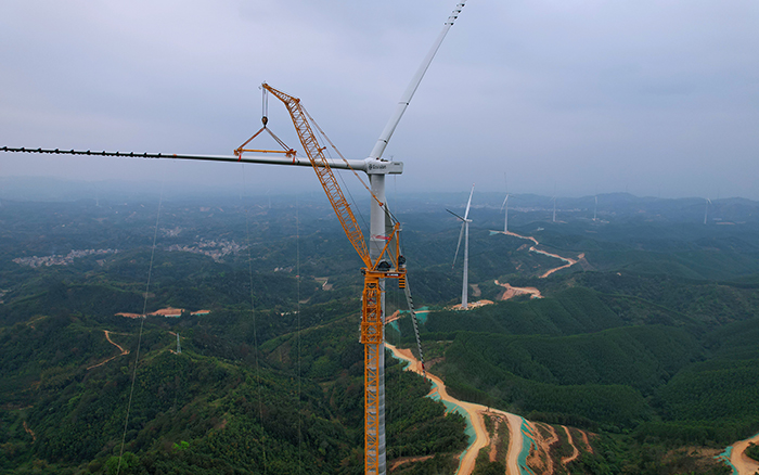 清晨的薄霧還未散盡,廣西貴港的山脊線上,一臺鋼鐵巨擘已悄然矗立。這里海拔在110m至650m之間起伏,山勢錯落、峰巒疊嶂。施工區(qū)域道路蜿蜒、坡陡彎急,作業(yè)面狹小局促,四周云霧繚繞,氣候更是瞬息萬變。對風(fēng)電吊裝而言,這是寸步難行的“天險”。